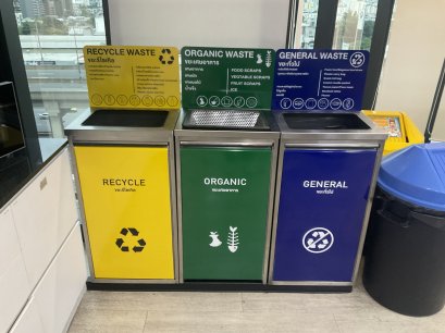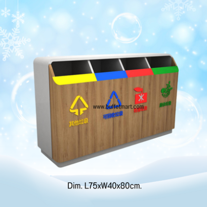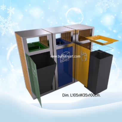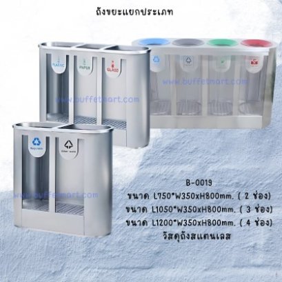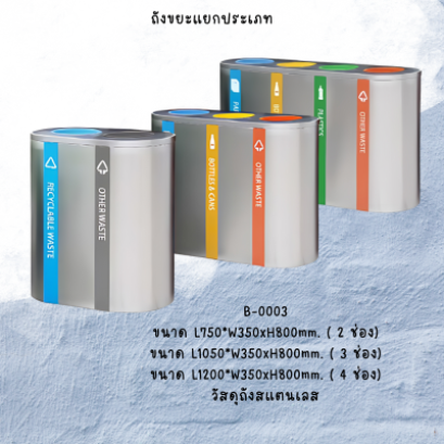 ถังขยะแยกประเภท 3 ช่องแยกขยะเศษอาหาร ขยะรีไซเคิล และ แยกขยะทั่วไป ขยะเศษอาหารจะมีตะกร้ากรองเศษอาหาร รับผลิต 1 -4 ช่อง