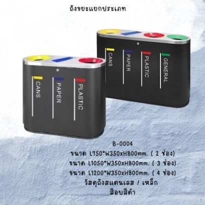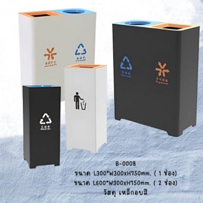 ถังขยะแยกประเภททรงสี่เหลี่ยมสีดำ หรือ สีขาว ถังขยะคัดแยกขยะวัสดุเหล็ก หรือ สแตนเลส ผลิตได้หลายแบบ แยกช่องตามประเภทขยะ เช่น ขยะกระดาษ ขยะรีไซเคิล