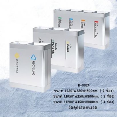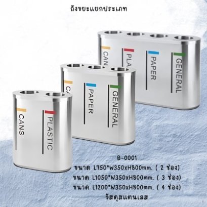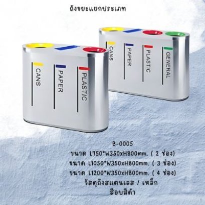 ถังขยะสแตนเลส ถังขยะแยกประเภท แบ่งประเภทขยะ เช่น กระดาษ กระป๋อง พลาสติก ทั่วไป วัสดุสแตนเลส และ เหล็ก ด้านบนมีช่องทิ้งขยะ 2 ช่อง 3 ช่อง 4 ช่อง
