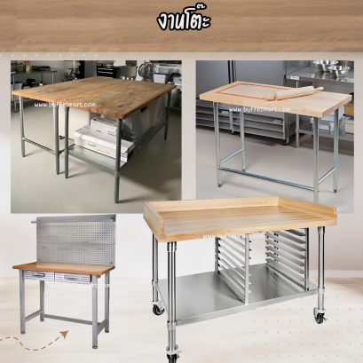โต๊ะนวดแป้งท๊อปไม้ โครงสแตนเลส เป็นโต๊ะอเนกประสงค์ หน้าโต๊ะเป็นไม้ โครงสแตนเลส เหมาะสำหรับนวดแป้ง หรือ เป็นโต๊ะที่ต้องการความแข็งแรงของหน้าท๊อป