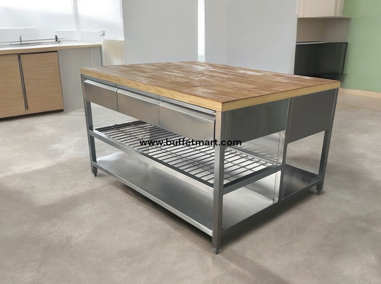 โต๊ะนวดแป้งสแตนเลส วัสดุหน้าโต๊ะจะเป็นสแตนเลส และโครงสแตนเลส ข้อดีของหน้าโต๊ะนวดแป้งที่เป็นสแตนเลสคือ ไม่แตกง่าย ทำความสะอาดง่าย มีความเย็นไว ไม่เป็นคราบมันหรือสะสมเชื้อโรค